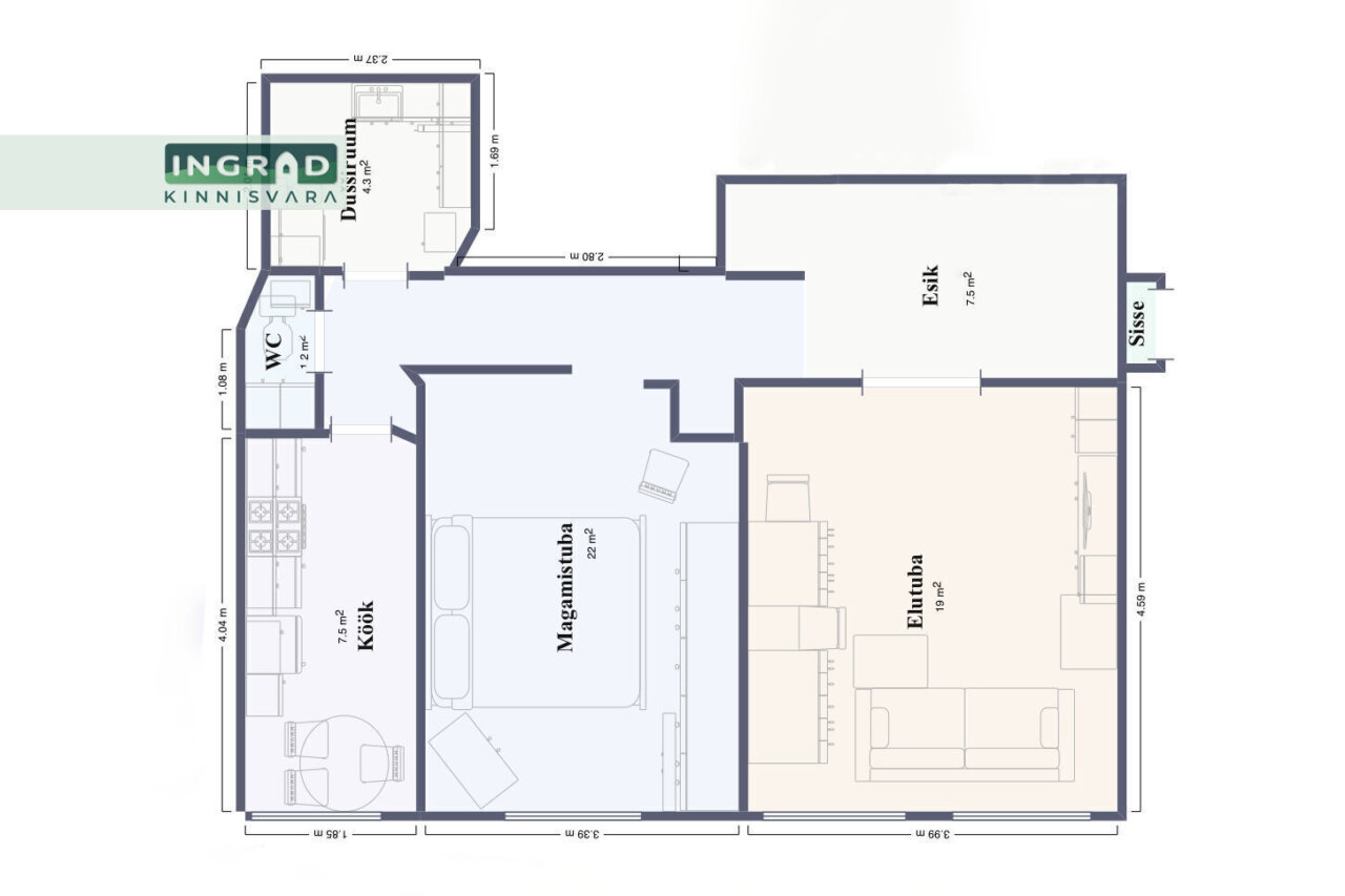 Läbimõeldud planeering, kaks eraldiseisvat tuba, eraldi köök ja avar koridor, mis annab lisaruumi.