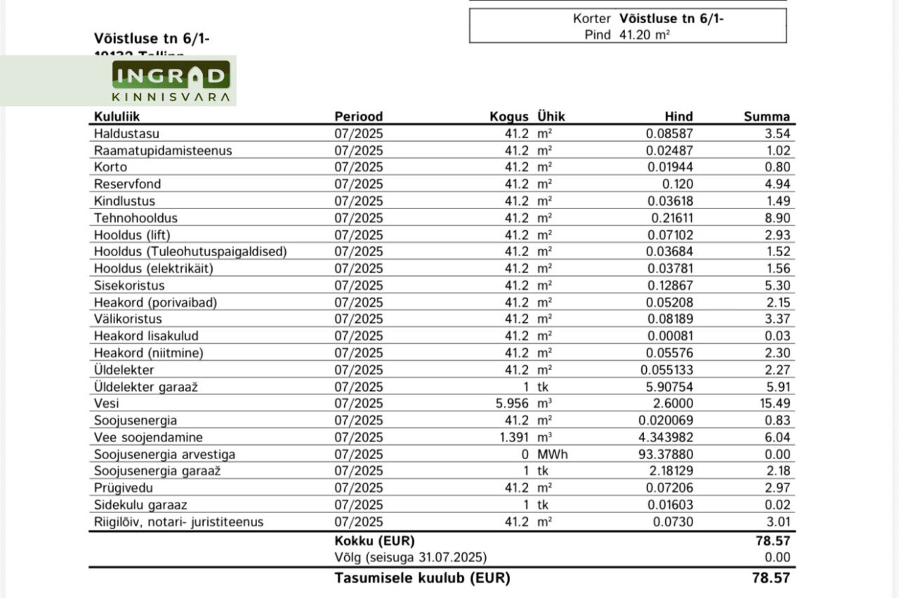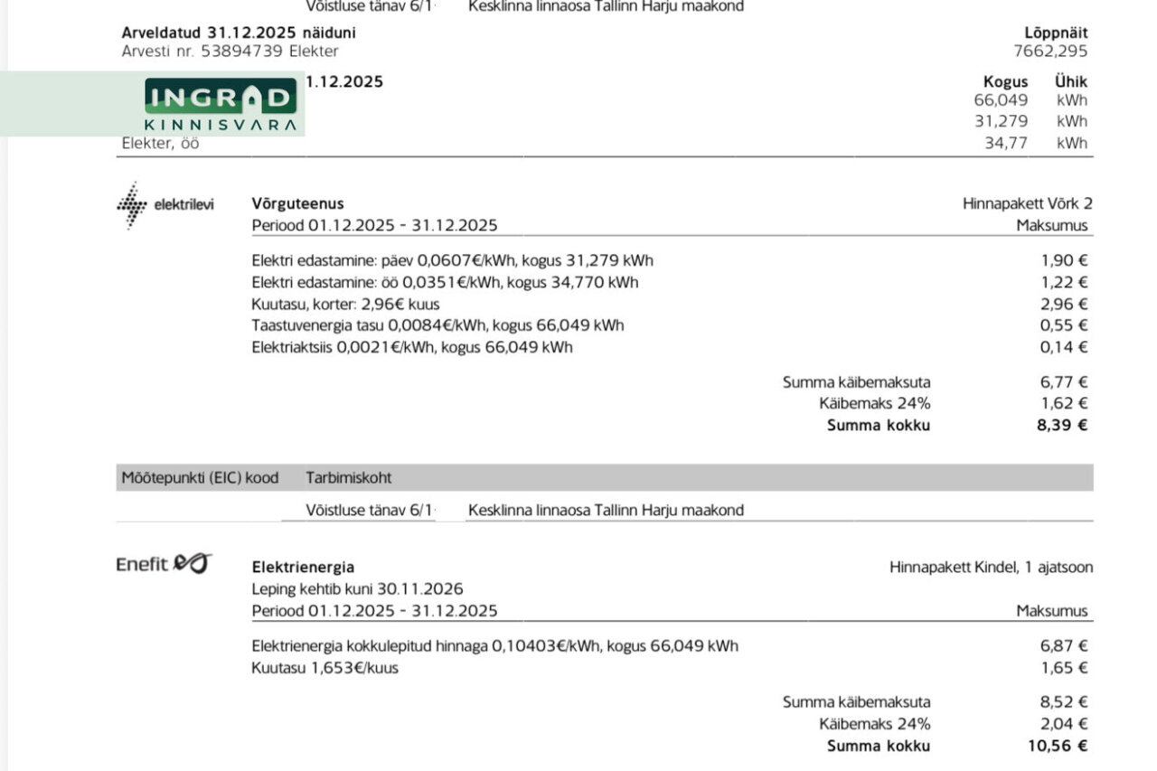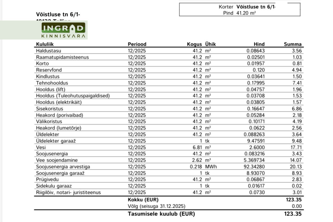 Lepingutasu: 1 kuu üür + käibemaks