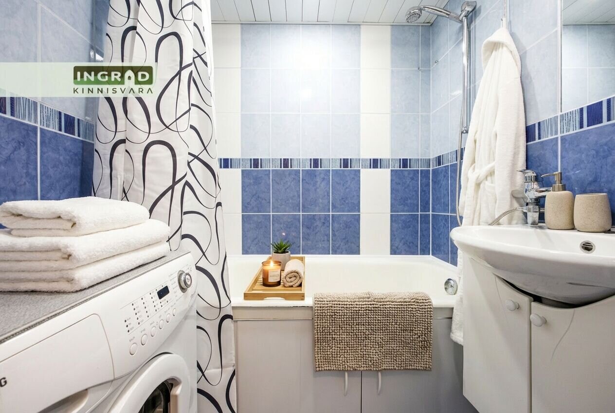 Ванная комната и туалет раздельные. В ванной — ванна и стиральная машина.