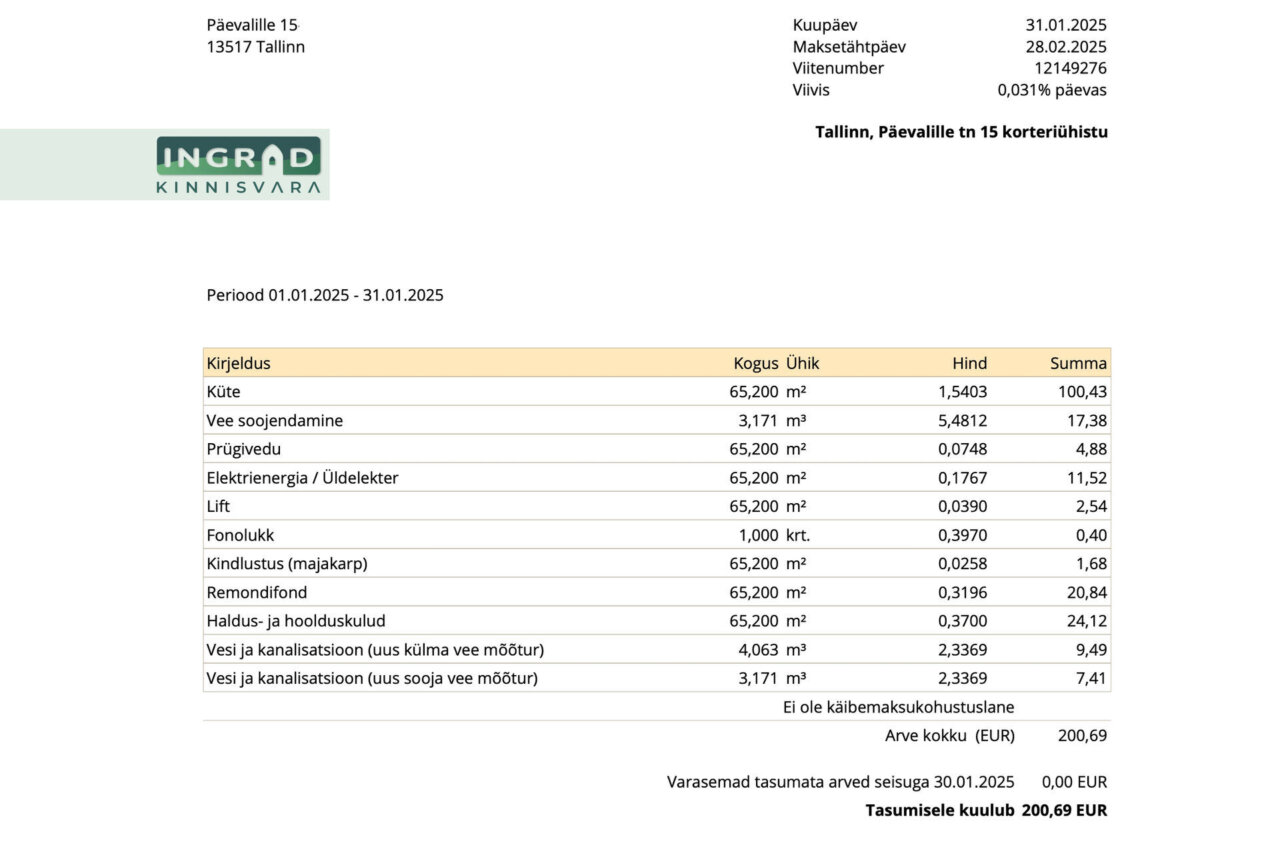 Suvised kommunaalkulud on ligikaudu 100 € ja talvised umbes 200 €, millele lisandub elektrikulu vastavalt tarbimisele.