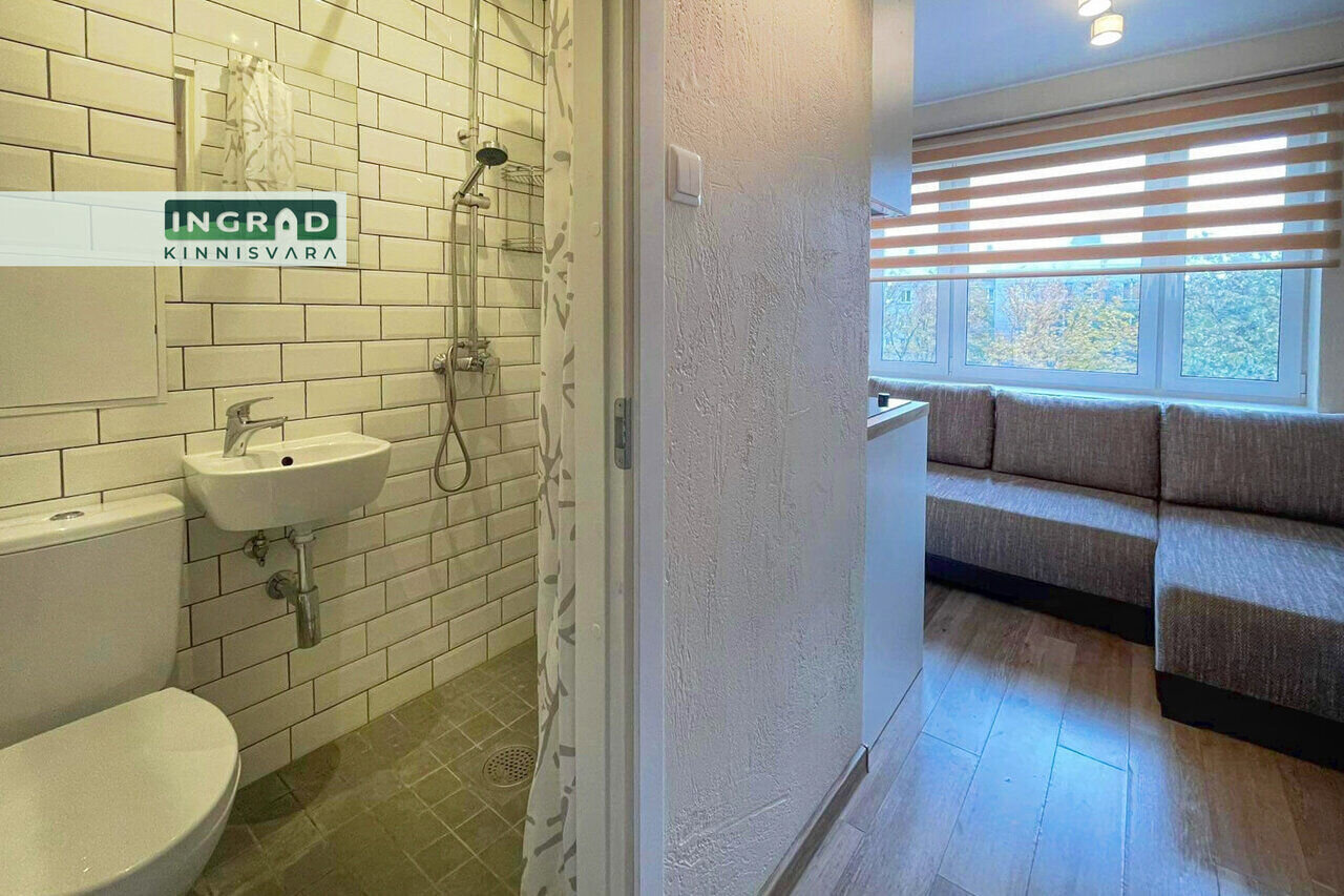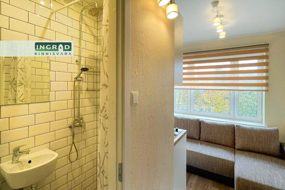 Планировка: гостиная с кухней, санузел с душем и прихожая.