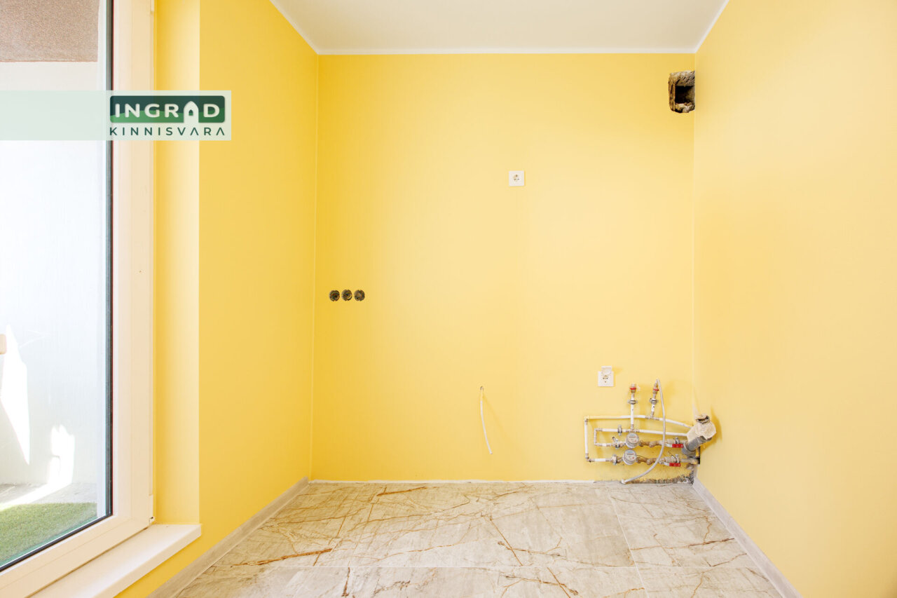Кухонный гарнитур не установлен, однако все подключения, розетки и коммуникации выведены — это даёт возможность новому владельцу реализовать кухню полностью под себя. Подключение для стиральной машины выведено за пределы ванной комнаты, что делает использование пространства более удобным.