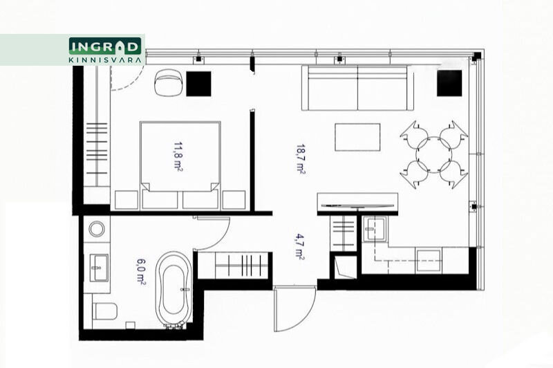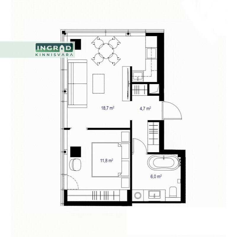 Внимание: Спальня и гостиная соединены открытым проходом (без двери), поэтому квартира идеально подходит для одного человека или максимум для двоих взрослых (пары без детей).